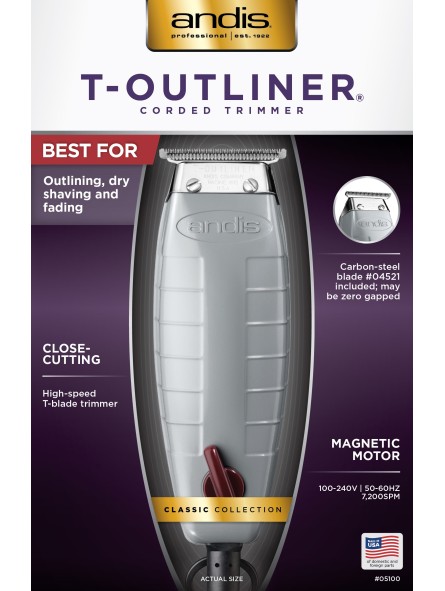 Modèle emblématique de la marque ANDIS, la tondeuse filaire T-Outliner est équipée d’une tête de coupe en T, idéale pour les contours précis et le rasage de près. Ses lames en acier au carbone, robustes et durables, offrent une finition parfaite.